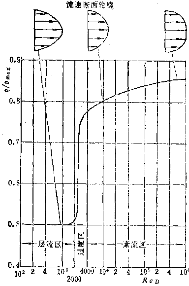 雷诺数小,意味着流体流动时各质点间的粘性力占主要地位,流体各质点平行于管路内壁有规则地流动,呈层流流动状态。雷诺数大,意味着惯性力占主要地位,流体呈紊流流动状态,一般管道雷诺数Re<2000为层流状态,Re>4000为紊流状态,Re=2000~4000为过渡状态。在不同的流动状态下,流体的运动规律.流速的分布等都是不同的,因而管道内流体的平均流速υ与最大流速υmax的比值也是不同的。因此雷诺数的大小决定了粘性流体的流动特性。下图表示光滑管道的雷诺数ReD与速度比V/Vmax的关系。