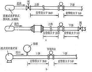 如果是使用活塞式或罗茨式的鼓风压缩机气体管道或柱塞式泵的高压液体管道(约1MPa),流体容易发生振动,此时,应把阀门安装在流量计上游,最好是在流量计上游装一个液体减振器;同时应考虑在流量计上游安装储罐以减少流体振动(见图2)。